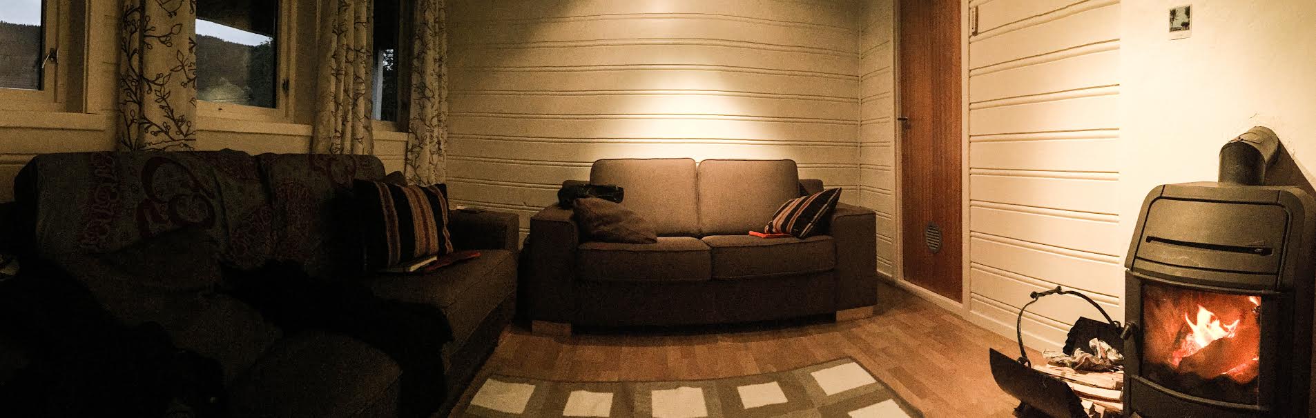 Es blanco y de madera, uno de los materiales más abundantes del país. Tiene una cocinilla, un baño con suelo caliente (le das a un botón y se calienta el suelo, ¡qué invento!), una cama doble con buen edredón, y un luminoso saloncito con chimenea. ¡Chimenea! Es la primera vez que alquilo un casa con chimenea. Este sitio no me gusta, me encanta. Me parece el apartamento más bonito del mundo.